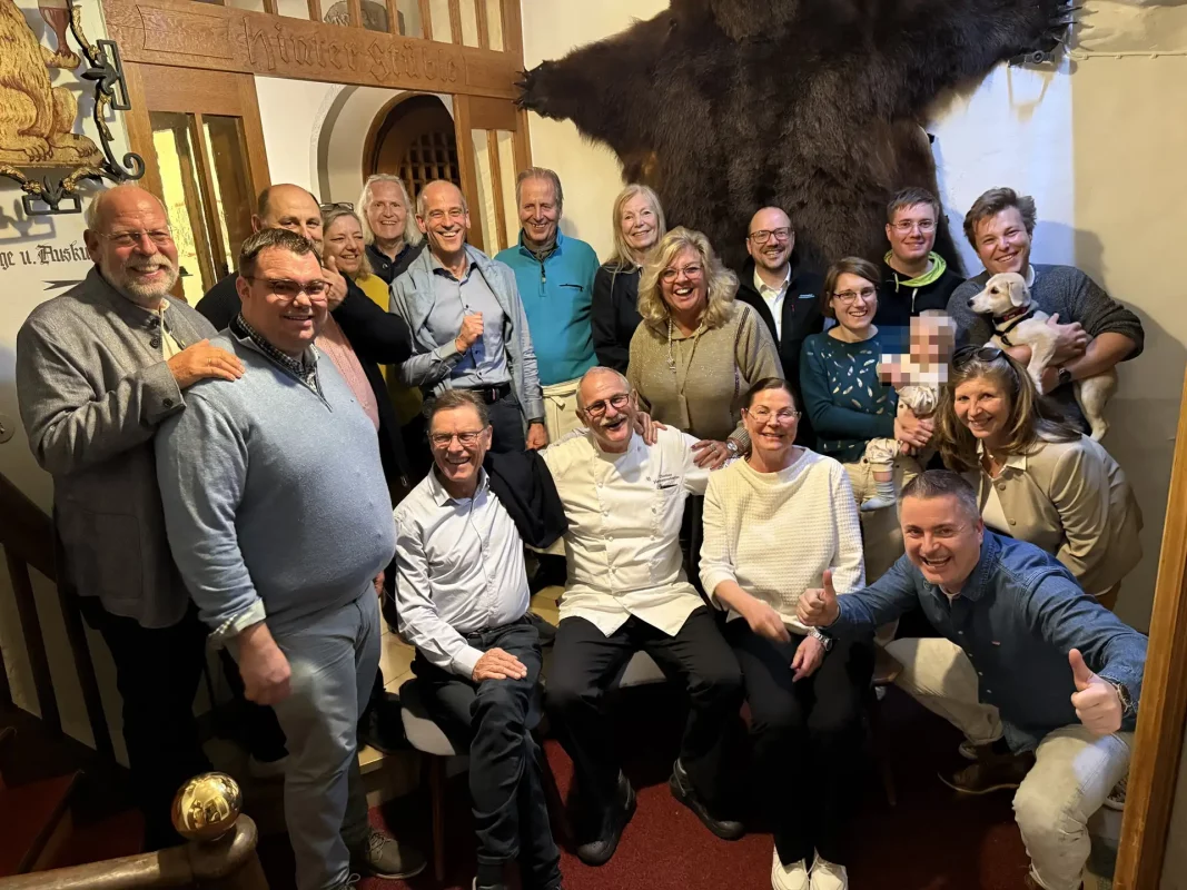 Bodensee-Allgäu. Anlässlich des 100-Jahre VHH-Jubiläums traf sich die Region Bodensee-Allgäu Mitte Oktober in Meersburg. Das Treffen stand ganz im Zeichen des Zeppelins. Am Nachmittag besuchte die Gruppe das Zeppelinmuseum in Meersburg. Ein kleines Museum am Fuße der Burg zeigt eine umfangreiche Privatsammlung von Originalstücken aus den Zeppelinen wie Speisekarten, Geschirr, Uniformen aber auch von Graf Zeppelin persönlich, wie seine Wiege. Im Anschluss empfing Michael Gilowsky die Runde im Hotel Bären, dem ältesten Hotel im Herzen der Meersburger Altstadt, das an diesem Abend extra an seinem Ruhetag das Restaurant öffnete. Unterstützung bekam er von Thomas Hermannsdorfer, der den Kochlöffel schwang und ein fantastisches Vier-Gang-Menü zauberte aus Gerichten, wie sie auf den Zeppelinflügen serviert wurden. Den Abend begleitete Thomas Brandt, ehemaliger Geschäftsführer von Zeppelin NT, der ein paar Anekdoten aus seiner Wirkungszeit bereit hielt und die Hintergründe zur Überführung des LZ126 beleuchtete. 2024 jährte sich die Reparationsleistung nach dem ersten Weltkrieg an Amerika zum 100. Mal. Es war ein geselliges Treffen mit Familien, Freunden, Vorstandsmitgliedern und Gästen aus anderen VHH-Regionen.