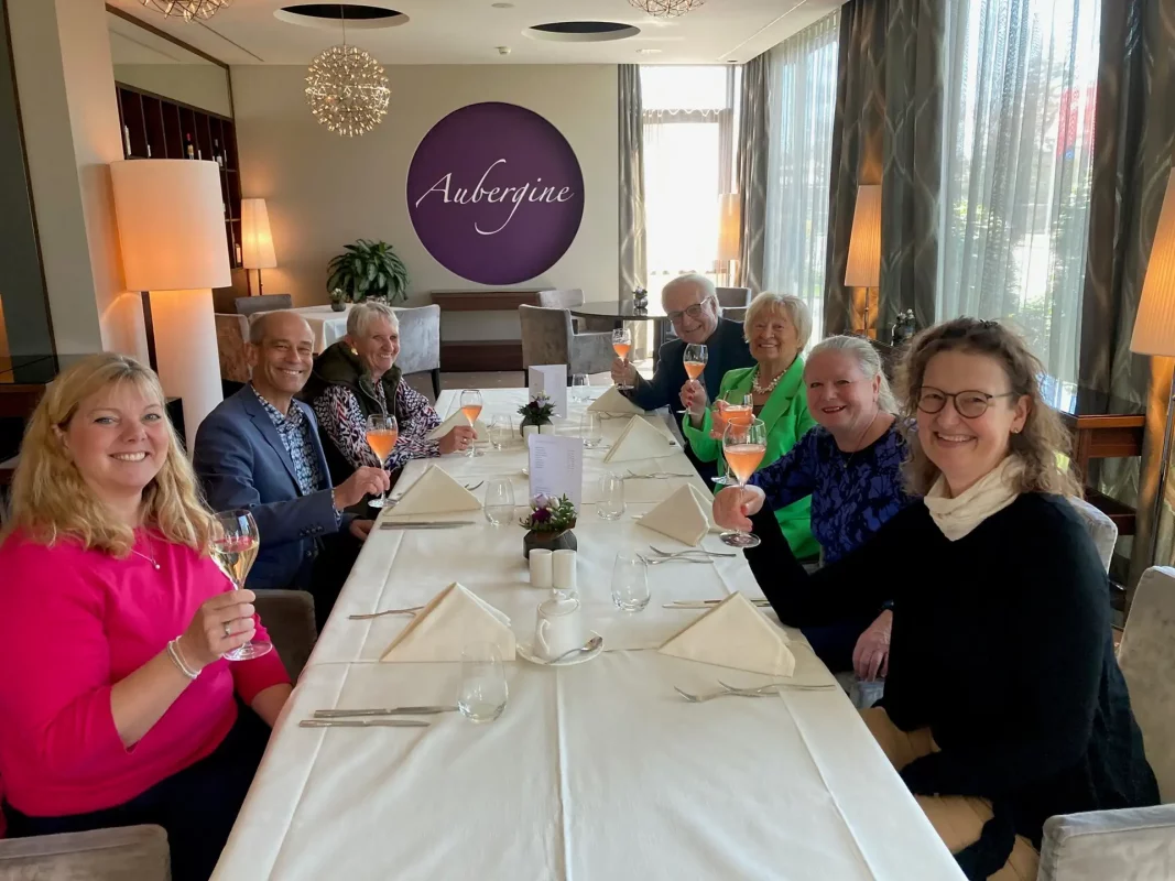 München. Im April stand die Besichtigung des familiengeführten Hotels Vier Jahreszeiten in Starnberg auf dem Programm. Das Hotel wird von Mario Landthaler (09/11) geführt, der leider an diesem Tag nicht anwesend sein konnte. Auf Einladung der Direktion stimmte sich die Münchner Gruppe in der Hotelbar „Hemingway“ mit einem Aperitif und Vortrag auf die Führung ein. Bei der Besichtigung bestach besonders der Spa-Bereich mit Terrasse im obersten Stockwerk, der zu seinen Vorzügen auch noch einen schönen Alpenblick bietet. Im Anschluss an die Besichtigung stärkten sich die Gäste beim „Sundays Best“ Lunchbuffet im Gourmetrestaurant Aubergine. Alle genossen das hervorragende Essen und den angeregten Austausch. „Auf diesem Wege noch einmal herzlichen Dank für die Einladung und die herzliche Betreuung durch das freundliche Team. Wir haben uns sehr wohl gefühlt!“